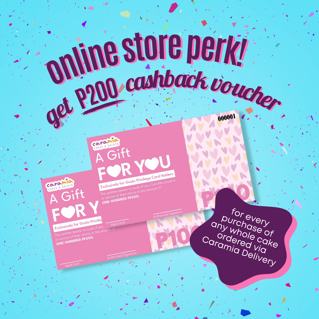 Free Php 200 Caramia Gift Vouchers with a single purchase of any whole cake ordered via www.caramia.ph or 8-822-1111 (applicable for delivery transactions only).